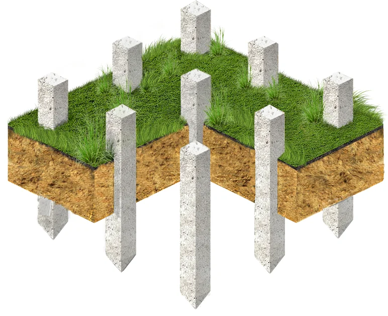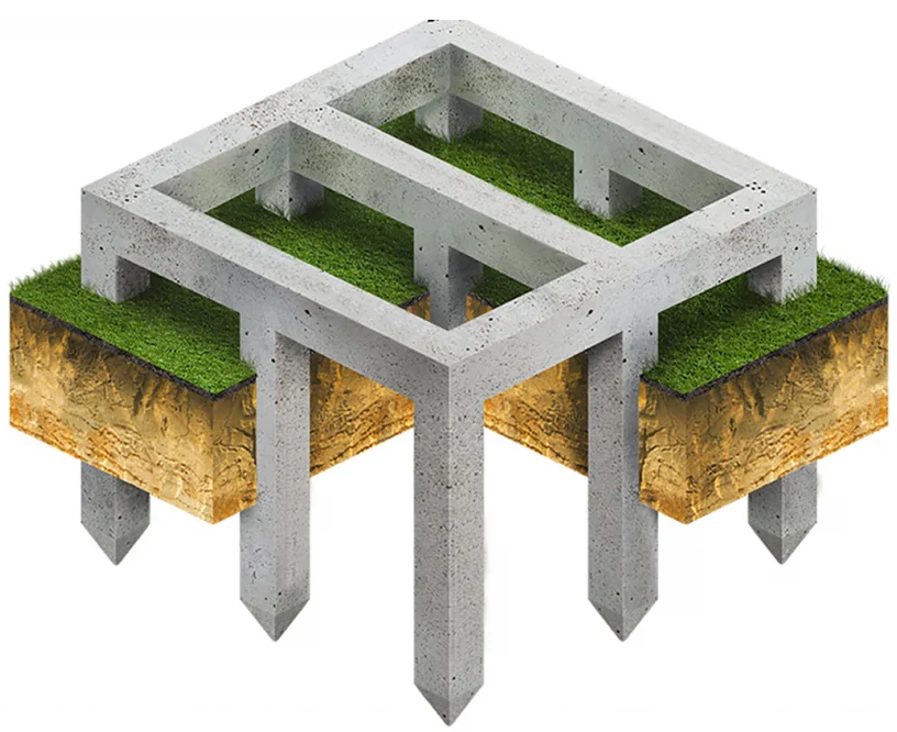 Классический фундамент на сваях – это конструкция, состоящая из вертикальных опор, погруженных в грунт и связанных между собой ростверком.
